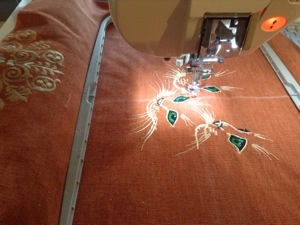 To create the embroidery I need to carefully centre an embroidery hoop on the fabric, attach my laptop which now has the pattern on it, to my machine, look out some threads that will blend with the embroidery on the cloth and get cracking!